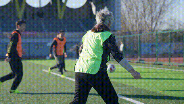 为了让奶奶们真有底、完整了解规则,作为前职业球员的马德李亲自上阵,和场上的队员们配合打了个样,一脚推射入网,轻轻松松踢进了空门。